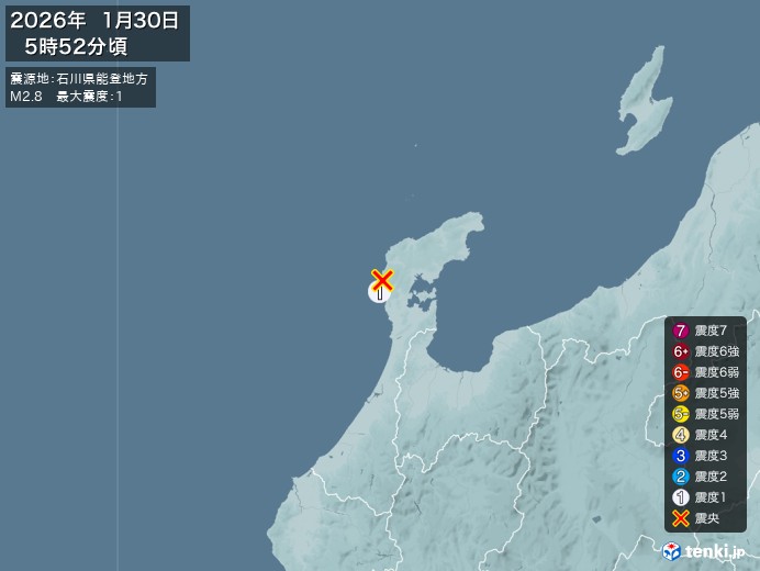 5時52分ごろ、M2.8 石川県能登地方 北緯37.2度 東経136.7度 深さ10km 最大震度1 志賀町 https://earthquake.tenki.jp/bousai/earthquake/detail/2026/01/30/2026-01-30-05-52-52.html
