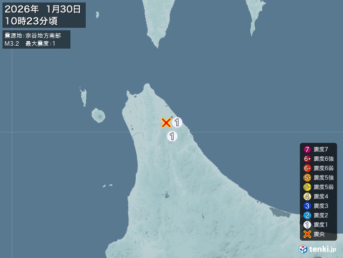 10時23分ごろ、M3.2 宗谷地方南部 北緯45.1度 東経142.2度 深さごく浅い 最大震度1 有感地震 https://earthquake.tenki.jp/bousai/earthquake/detail/2026/01/30/2026-01-30-10-23-13.html