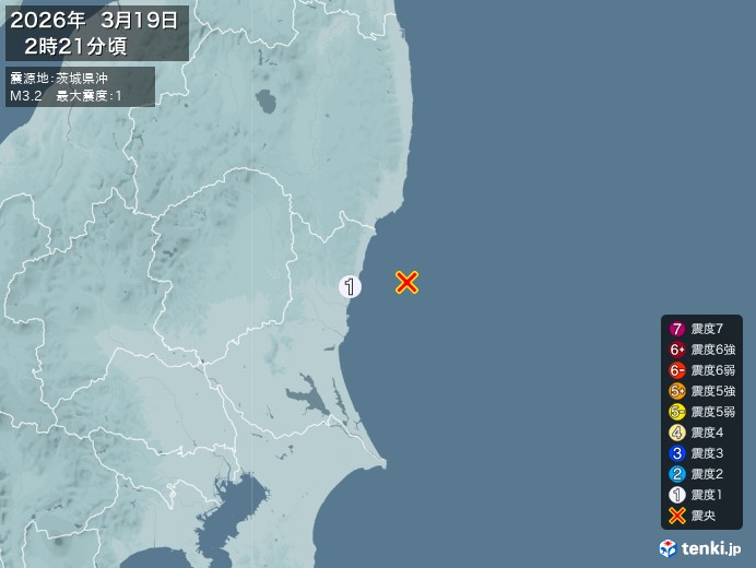 2時12分ごろ、M3.2 茨城兼沖 北緯36.6度 東経141.0度 深さ50km 最大震度1 日立市 https://earthquake.tenki.jp/bousai/earthquake/detail/2026/03/19/2026-03-19-02-21-53.html