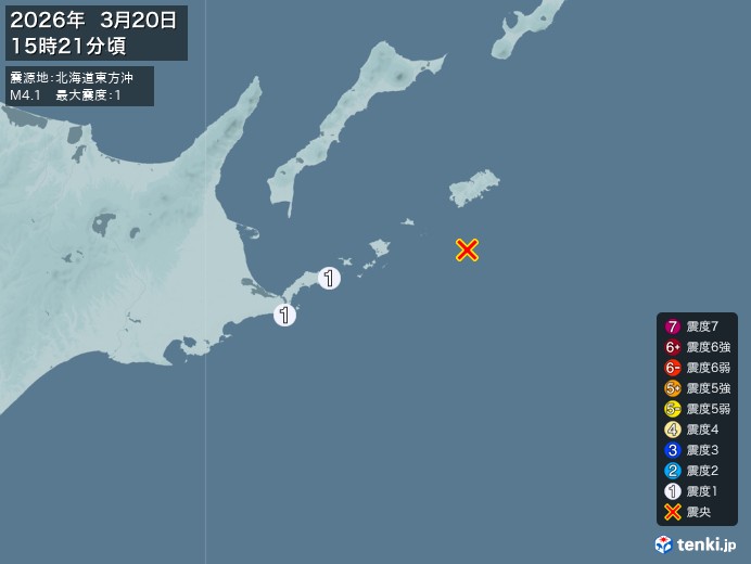 15時21分ごろ、M4.1 北海道東方沖 北緯43.5度 東経146.7度 深さ40km 最大震度1 根室市 https://earthquake.tenki.jp/bousai/earthquake/detail/2026/03/20/2026-03-20-15-21-14.html