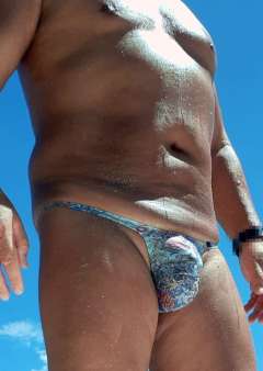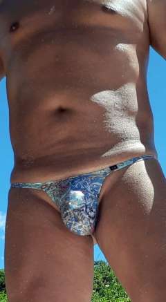 TMのTバックショーツです。このアングルの写真は投稿していなかったようです。夏の空気感が伝わりませんか?私の粗末な息子たちではポーチを満たすことはできません。自分的には自己満足ラインを越えていると思っているのですが、いかがでしょうか?
