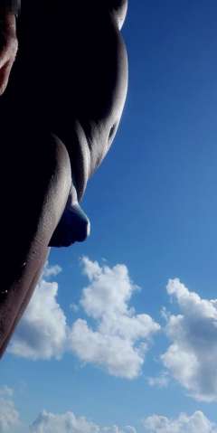 昼食を食べた直後、お腹の力を抜いて立つとご覧の有様。青空のグラデと雲、逆光のシルエットの組み合わせ。面白い画だったのでアップしてみました。