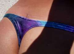 もう1枚。今年のTバックのお尻です。スマホを持つ自分の腕の影が、大きく映り込んでしまいました。まだ4回目の海だったので、Tバックの日焼け跡がずれないように気を遣っていた頃です。紫外線の量をコントロールできなかったせいで、すでに皮がむけているのが分かります。(失敗!)