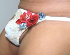 1月10日(土)です。昨夜からTMのキラキラ2WAYとんがりGストリング(イエロー色)を穿いています。生地がほとんど伸びないので、通常の時でも愚息しかポーチの中に収まらず、両ふぐりはアウト・オブ・ポーチです。尚更、愚息がちょっと元気になると画像の通り。しかし購入して2回目の着用でが、生地や形とは裏腹に、通常穿きとしても不思議と快適です。商品名が「とんがり」ですから、愚息が元気なときの見栄えや、ジャージを穿いたときに股間を強調する効果があることは実感しています。 最初からコテカのように愚息だけが収まればいいデザインなのか、私が考える以外の穿き方があるのか、くだらない疑問があります。