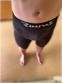 自宅でエクササイズ中。 ペニスポケット付きのスパッツなので超もっこりしちゃいますね(汗) ランニング以外の日常生活では終日このスパッツを穿いて過ごしています。 通常は竿を下向きに玉袋と一緒にペニスポケットへ収納しています。