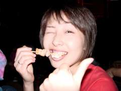 焼鳥を食べて喜ぶ「久美子」さん