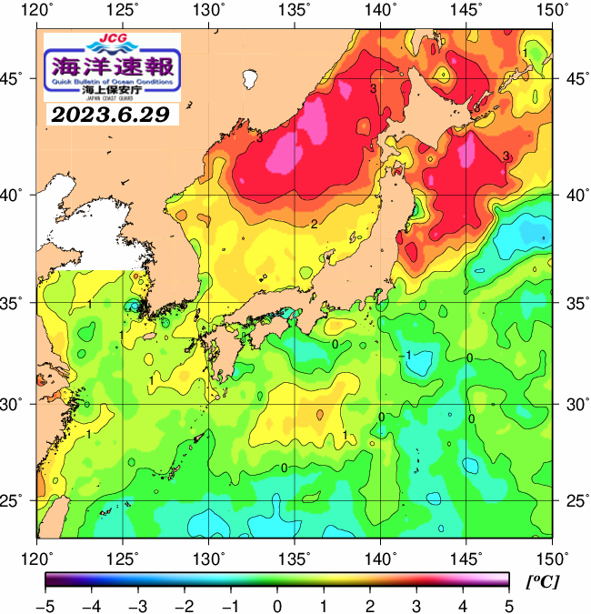 6月29日の、海水表面温度(平年比)、 https://www1.kaiho.mlit.go.jp/KANKYO/KAIYO/qboc/anomaly/anomaly.html