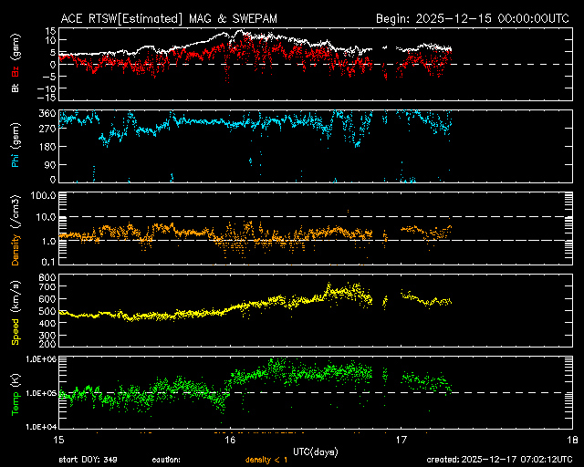 太陽風、 0時51分647km/s・+0.7nT・磁気圏16nT、 1時52分655km/s・ー0.9nT・磁気圏16nT、 2時51分659km/s・ー1.2nT・磁気圏12nT・プロトン0.2(最高0.2)10MeV・放射線対電子500(最高900)2MeV、 3時52分633km/s・ー0.4nT・磁気圏19nT・プロトン0.2(最高0.3)・電子600(最高1千)、 4時51分598km/s・+0.5nT・磁気圏17nT・プロトン0.2・電子600、 5時51分595km/s・+3.0nT・磁気圏14nT、 6時52分596km/s・ー2.4nT・磁気圏15nT、 7時51分567km/s・+0.7nT・磁気圏15nT、 8時52分5595km/s・km/s・ー0.6nT・磁気圏15nT・プロトン0.2・電子700、 9時51分588km/s・+1.4nT・磁気圏16nT・プロトン0.2・電子700、 10時52分616km/s・+2.1nT・磁気圏19nT、 11時52分588km/s・+1.0nT・磁気圏17nT・プロトン0.2・電子600、 12時52分564km/s・ー0.3nT・磁気圏15nT、 13時52分565km/s・ー1.8nT・磁気圏17nT、 14時52分571km/s・ー1.1nT・磁気圏18nT、 15時52分577km/s・+1.3nT・磁気圏16nT・プロトン0.2・電子200、