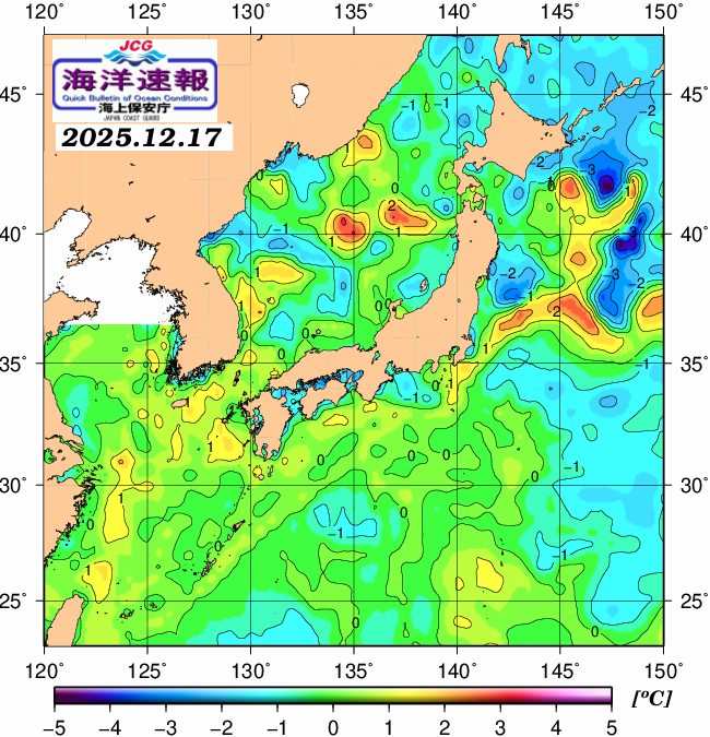 12月17日の、海水表面温度(平年比)、 https://www1.kaiho.mlit.go.jp/KANKYO/KAIYO/qboc/anomaly/anomaly.html