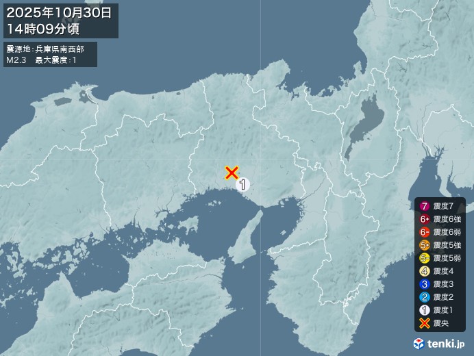 14時9分ごろ、M2.3 兵庫県南部 北緯34.9度 東経134.7度 深さ10km 最大震度1 加古川市 https://earthquake.tenki.jp/bousai/earthquake/detail/2025/10/30/2025-10-30-14-09-28.html