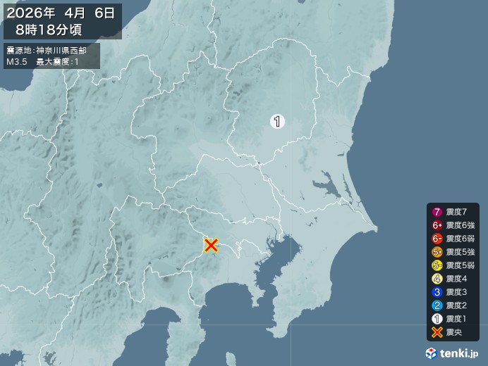 8時18分ごろ、M3.5 神奈川県西部 北緯35.6度 東経139.2度 深さ140km 最大震度1 宇都宮市 https://earthquake.tenki.jp/bousai/earthquake/detail/2026/04/06/2026-04-06-08-18-14.html