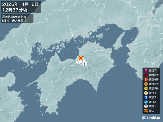 12時37分ごろ、M3.0 徳島県北部 北緯34.0度 東経133.7度 深さごく浅い 最大震度1 有感地震 https://earthquake.tenki.jp/bousai/earthquake/detail/2026/04/06/2026-04-06-12-37-28.html